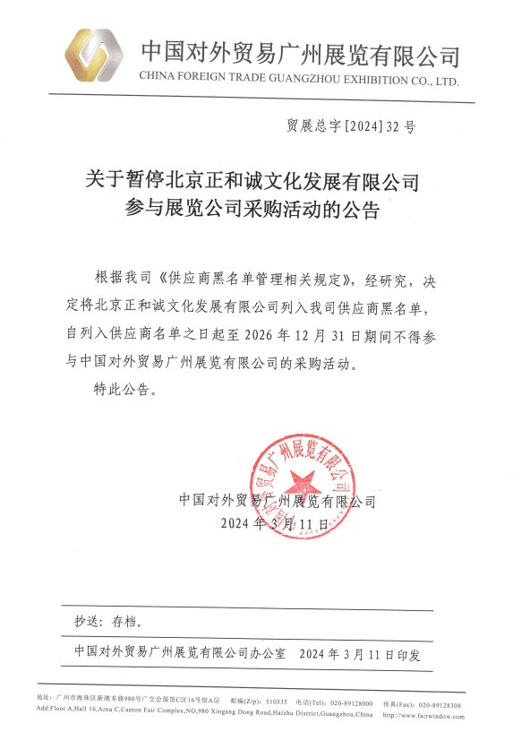 关于暂停北京正和诚文化发展有限公司参与展览公司采购活动的公告